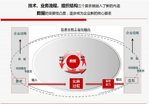 兩化融合,即工業(yè)化與信息化的深度融合,是一項(xiàng)國(guó)家戰(zhàn)略決策。通過(guò)在企業(yè)內(nèi)部推行并建立一套管理體系,形成企業(yè)長(zhǎng)期推動(dòng)兩化融合的內(nèi)在機(jī)制。輔助企業(yè)理清業(yè)務(wù)模式和業(yè)務(wù)流程,消除內(nèi)部管理阻力;以制度創(chuàng)新保障技術(shù)創(chuàng)新、商業(yè)模式創(chuàng)新,形成良性循環(huán)。在操作層面體現(xiàn)為不斷推進(jìn)數(shù)據(jù)、技術(shù)、業(yè)務(wù)流程、組織結(jié)構(gòu)四個(gè)基本要素互動(dòng)創(chuàng)新和持續(xù)優(yōu)化的過(guò)程!
